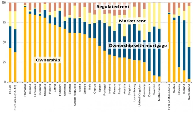 Znamená to, že je v Česku průměrný tržní nájem na 60 % německé úrovně a téměř 80 % rakouské. Úroveň platů je poněkud jiná. Na rozdíl od těchto zemí však většina Čechů bydlí ve vlastním.