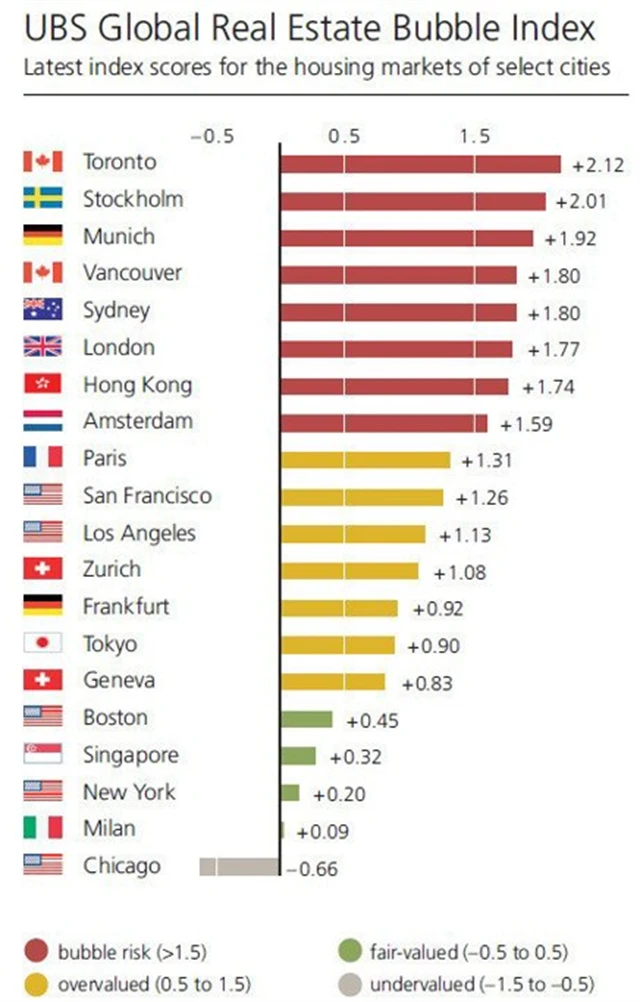 Global Real Estate Bubble Index z dílny UBS ve svém posledním vydání označuje za nejrizikovější Toronto, kde ceny za 13 let narostly na dvojnásobek, zatímco nájemné a příjmy vzrostly o 5 %, respektive 10 %.