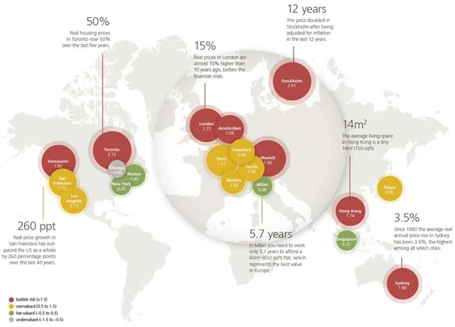 V Mnichově, Torontu, Amsterdamu, Sydney a Hongkongu pak ceny jen za poslední rok stouply o více než 10 %, což by za sedm let vedlo k jejich zdvojnásobení. Takové tempo není podle UBS udržitelné. Naopak v Londýně (byť je nadále mezi nejvíce "nafouknutými" trhy), Milánu a Singapuru ceny za uplynulý rok nevzrostly.