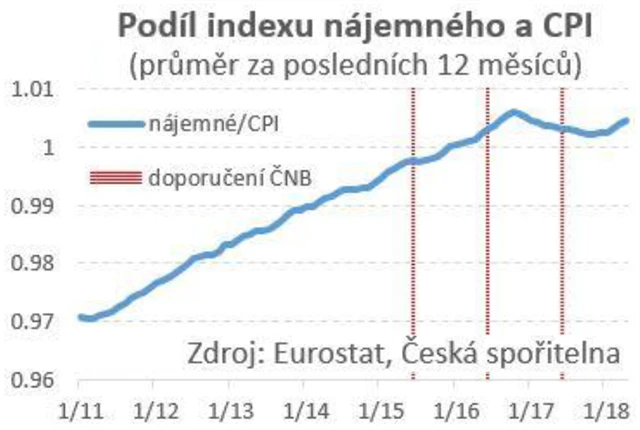 Ve prospěch teze, že nájemné může klesnout přinejmenším v reálném vyjádření, tedy v relaci k ostatním spotřebitelským cenám, může svědčit faktický vývoj v minulých letech zachycený v grafu.