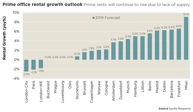 Průměrné výnosy z prvotřídních kancelářských prostor se v Evropě pohybují na rekordním minimu (3,65 % ve třetím kvartálu 2018), nehledě na to však tyto nemovitosti zůstanou hlavní volbou investorů i v roce 2019, obzvláště těch, jejichž cílem je vyhnout se riziku.