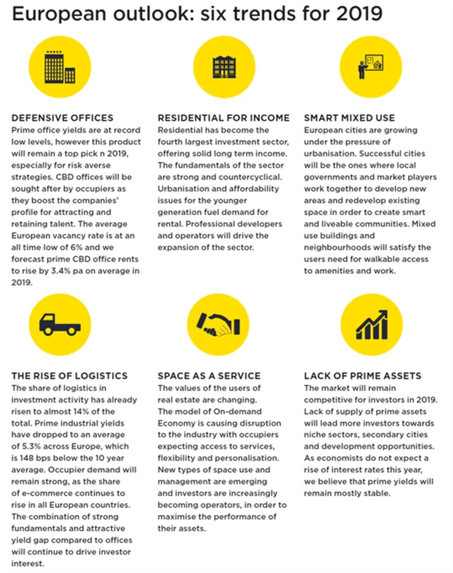 V roce 2019 budou pro vývoj evropského investičního trhu s komerčními nemovitostmi určující především následující trendy: kanceláře situované v centrálních byznysových čtvrtích, rezidenční výstavba, inteligentní víceúčelové budovy, logistické nemovitosti, služby spojené s užíváním prostor a nedostatek prvotřídních nemovitostí.