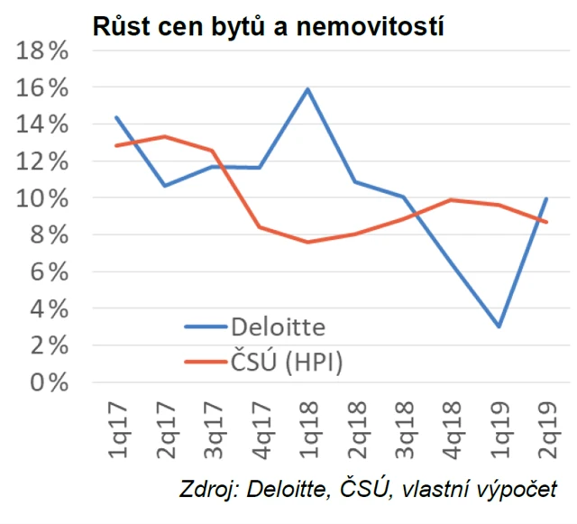Data ČSÚ se týkají všech nemovitostí všude v ČR, zatímco data Deloitte jen bytů v krajských městech. Srovnání je proto možné dělat jen velice zhruba. Obě křivky v grafu nicméně i přes tento metodický rozdíl naznačují, že nemovitosti v Česku zdražují aktuálně pomaleji než v minulých letech.