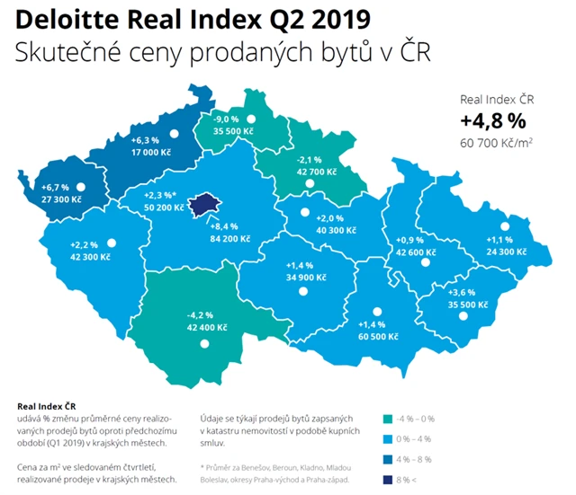 Analytikům z Deloitte na základě transakčních údajů zapsaných v Katastru nemovitostí vyšlo, že průměrná reálná prodejní cena bytu ve druhém kvartálu činila v celé České republice (tím se rozumí krajská města) zhruba 60 700 Kč/m2. V samotné Praze, kde se v daném čtvrtletí odehrálo 61 % transakcí (měřeno hodnotou, nikoli počtem), byla průměrná cena dokonce 84 300 Kč/m2.