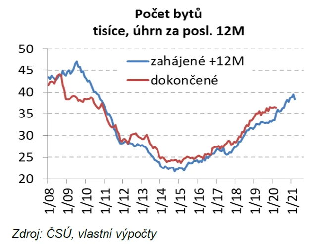 Počet zahájených staveb bytů v 12měsíčním období od května 2019 do dubna 2020 (data o výstavbě jsou hodně kolísavá, a tak je lepší sledovat souhrn za delší období) dosáhl v České republice 38 tisíc. Počet dokončených bytů dosáhl zhruba 35 tisíc.