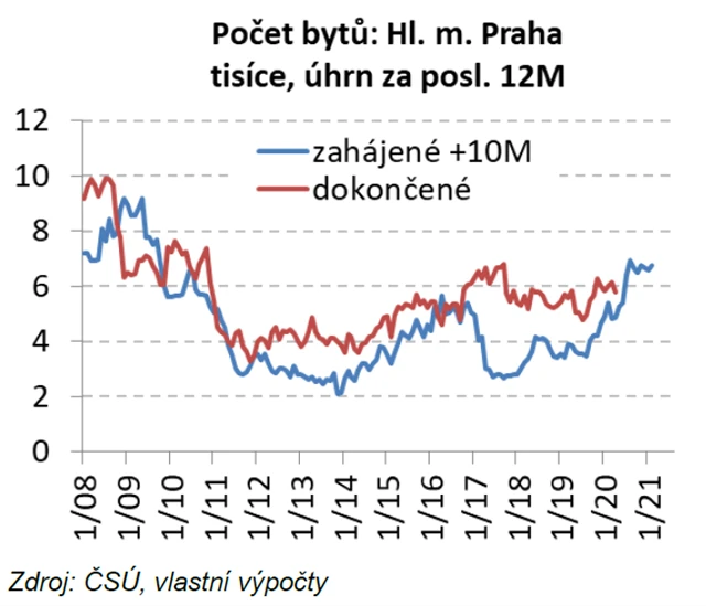 Naději na větší počet dokončených bytů v nejbližších měsících v sobě nesou data o zahájené výstavbě i konkrétně v Praze (kde se průměrné zpoždění zdá být pouze 10měsíční). I kdyby ale k onomu nárůstu došlo, bude to jen na úroveň lehce nad 6 tisíc bytů ročně, což je odhadovaná roční potřeba. Nezmenší se tím tedy manko, které se nahromadilo zejména v letech 2011-2016.