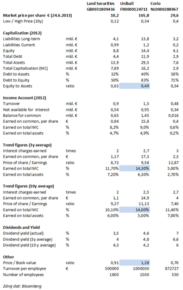 REIT mají vlastně jednoduchý model podnikání, jehož úspěch je založen na faktorech, které nemohou přímo ovlivnit (především na celkové hospodářské prosperitě země). Z hlediska akcionáře pak hraje podstatnou roli poměr vlastního kapitálu vůči aktivům a dluhu. Více dluhu, zvláště při nízkých sazbách, přinese akcionářům větší zisk na akcii. Vyznačil jsem modře, jak právě tento poměr pomohl francouzskému Unibailu dosáhnout největší rentability na vlastní kapitál, ale zákonitě také nejhoršího poměru ceny akcie k účetní hodnotě. Unibail je tedy z trojlístku nejvíce "spekulativní" ve smyslu kapitalizace.