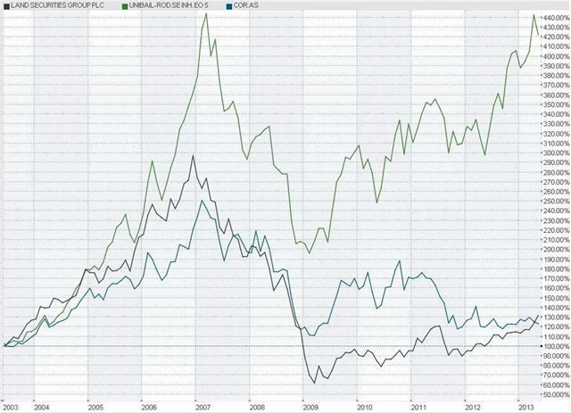 Níže uvedený graf ukazuje vývoj cen akcií sledovaných REIT od roku 2003. Je nutné zmínit, že Unibail Rodamco vznikla prakticky až v roce 2007 spojením těchto dvou realitních společností, což zapříčinilo skokový nárůst ceny. I přes "abnormální" propad realitního trhu ve sledovaném období jsou Corio a Land Securities zhruba o 30 % výše (+4 % pravidelná dividenda). To dává při složeném úročení a navýšení ceny v posledním období o 30 % zhruba dvojnásobek vložené částky, tedy přibližně 7% roční výnos.