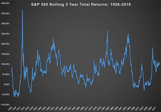 Průměrné hodnoty jsou zavádějící, což dokazuje i graf klouzavých pětiletých výnosů indexu S&P 500 od roku 1926.