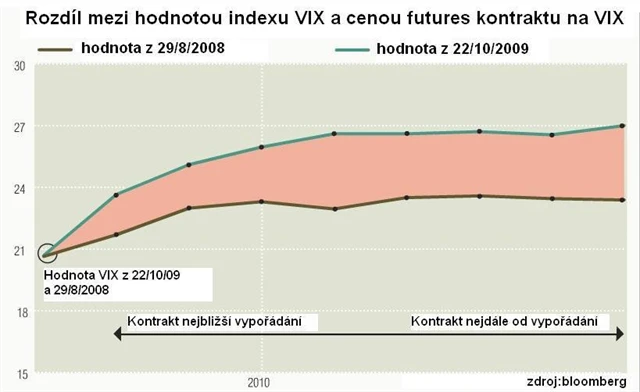 Přiložený graf ukazuje rozdíl mezi spotovou hodnotou indexu a její variantou s dodáním v budoucnu (futures). Dnes je tato hodnota „nejširší“ za posledních 14 měsíců. Kontrakt s nejbližším vypořádáním se předevčírem obchodoval na úrovni 23,65, což bylo o skoro 3 body výše, než je hodnota indexu. Tento rozdíl byl v srpnu 2008 jen 1,05 bodu.