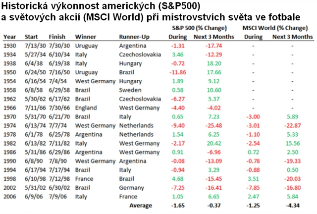Světové akcie, měřeno indexem MSCI World, od fotbalového šampionátu v roce 1970 ztratily během mistrovství světa 1,25 % a v následujících třech měsících 4,34 %.