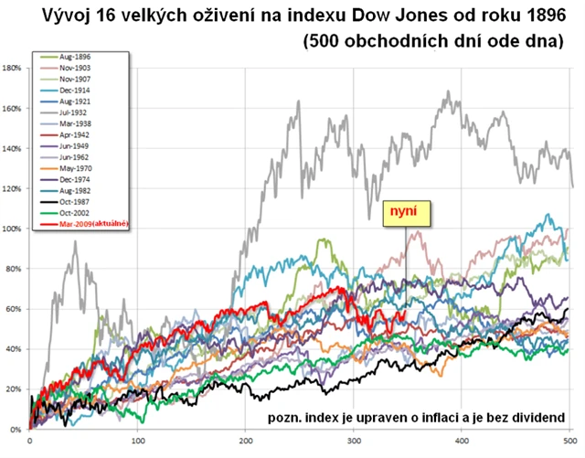 Jak se vyvíjí americký akciový index Dow Jones v porovnání s velkými oživeními v minulosti? Přiložený graf ukazuje průběh 500 obchodních dnů během šestnácti velkých oživení, které index zaznamenal od svého vzniku v roce 1896. Poslední oživení odstartovalo v březnu 2009.