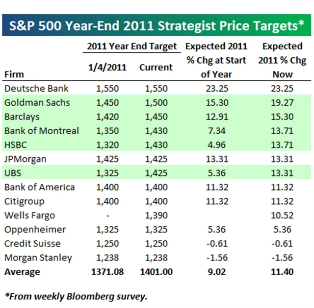 Hlavní stratégové analytických oddělení velkých finančních firem na Wall Street se každý týden vyjadřují ke svým celoročním cílovým cenám na americký akciový index S&P 500. Podle investiční společnosti Bespoke Investment Group a dat z agentury Bloomberg se jejich současné očekávání letošního zhodnocení indexu S&P 500 oproti počátku letošního roku navýšilo o 2,3 % - z lednových 1 371 bodů na nynějších v průměru 1 401 bodů. Z původního cíle +9,2 % se nyní stalo +11,4 %. Z jednotlivých brokerů navýšila Goldman Sachs svoji cílovou cenu ze 1 450 na 1 500 bodů, Barclays šla výše z 1 420 na 1 450, Bank of Montreal a HSBC shodně na 1 430 a cíl UBS se "pochlapil" dokonce o celých 100 bodů na úroveň 1 425.