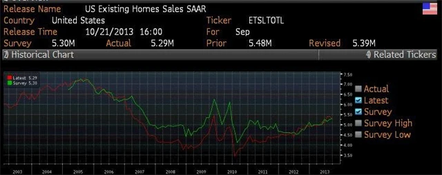 Prodeje existujících domů v USA za září skončily prakticky v souladu s očekáváním. Prodáno bylo 5,29 milionu domů (anualizovaně), čekal se prodej 5,3 milionu. Prodeje tak v posledních měsících prakticky stagnují. Mediánová cena prodaných domů lehce klesla na 199 tisíc USD.