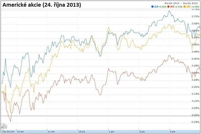 Americké akcie ve čtvrtek posilovaly díky příznivým hospodářským výsledkům některých významných podniků, například automobilky Ford Motor, Dow Chemical nebo Altria. Růstu cen akcií nezabránil ani předběžný index nákupních manažerů, podle kterého v říjnu americký výrobní sektor rostl nejpomaleji za poslední rok. Po závěru trhů zveřejnily výsledky svého hospodaření Microsoft, Amazon a Zynga.
