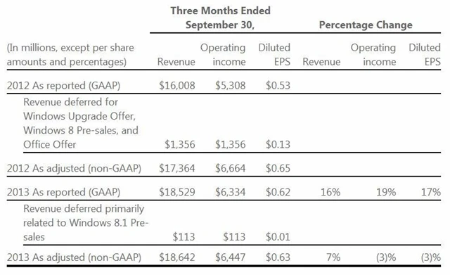Microsoft dosáhl čistého zisku 5,24 miliardy USD neboli 0,62 USD na akcii (odhad: 0,54 USD na akcii, loni: 0,53 USD na akcii) při tržbách 18,529 miliardy USD (odhad: 17,8 miliardy USD). Slabé výsledky vlajkového operačního systému Windows byly podle agentury Reuters kompenzovány silným prodejem kancelářského a serverového softwaru podnikům. Akcie na velmi dobré výsledky v after-marketu reagovaly růstem o více než 6 %.