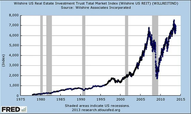 Podle následujícího grafu indexu Wilshire REIT, který měří výkon veřejně obchodovatelných akcií realitních společností (REIT) a slouží jako alternativa k přímím investicím do realitních společností, se na trhu s realitami nachází nová bublina, a to ještě větší než v roce 2008. Valuace realit se podle něj opět nacházejí na extrémních bublinových hodnotách.