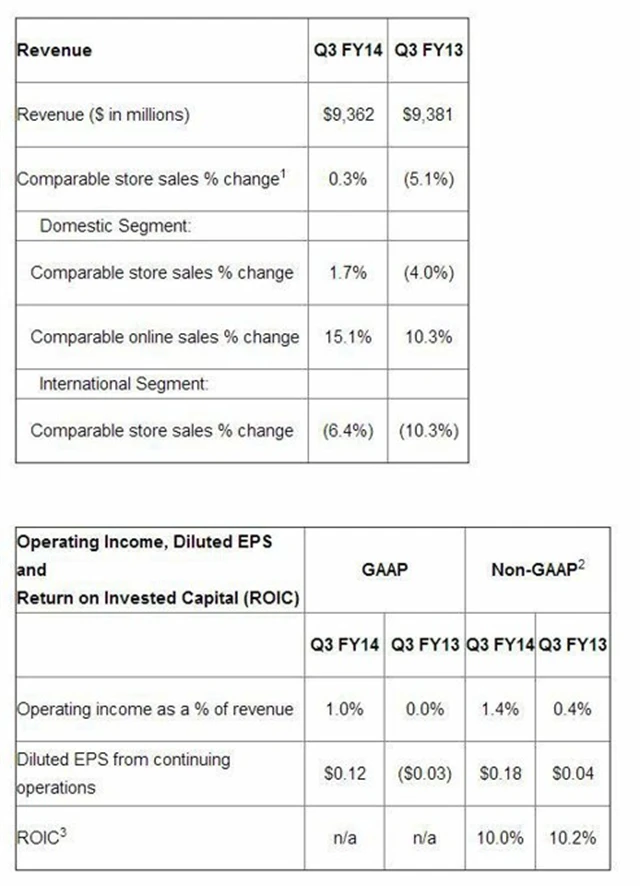 Zisk na akcii za tři měsíce do 2. listopadu činil 16 centů. Analytici podle agentury Bloomberg očekávali, že bude o čtyři centy na akcii nižší. Tržby ale prakticky stagnovaly na 9,36 miliardy dolarů. Analytici očekávali, že dosáhnou 9,37 miliardy USD.