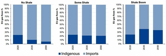 Závislost EU na dovozu plynu by se v roce 2035 snížila až na 62 % z 89 % v případě nevyužívání břidlic. Studie také zjistila, že by nové zdroje plynu výrazně snížily podíl uhlí na výrobě elektřiny, prakticky nijak by ale neovlivnily podíl obnovitelných zdrojů. Pokud by Evropa plyn z břidlic netěžila, podíl uhlí, které na jednotku energie tvoří podstatně více emisí než plyn, by se snížil jen minimálně, plyne z grafů studie.