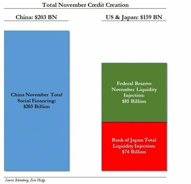 Zatímco se všichni zaměřují na Fed a Bank of Japan, zvýšila Čína množství peněz v oběhu jen za poslední měsíc zhruba o 20 %. Přes 200 miliard USD je více, než vytiskly centrální banky USA a Japonska dohromady.