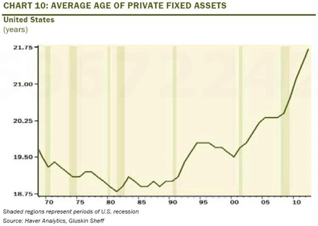 Vybavení amerických firem stárne, tvrdí David Rosenberg z Gluskin Sheff. Poukazuje tím na fakt, že firmy velmi brzy budou muset investovat do nového zařízení, čímž zaplaví trh hotovostí a nakopnou ho k dalším býčím výkonům.