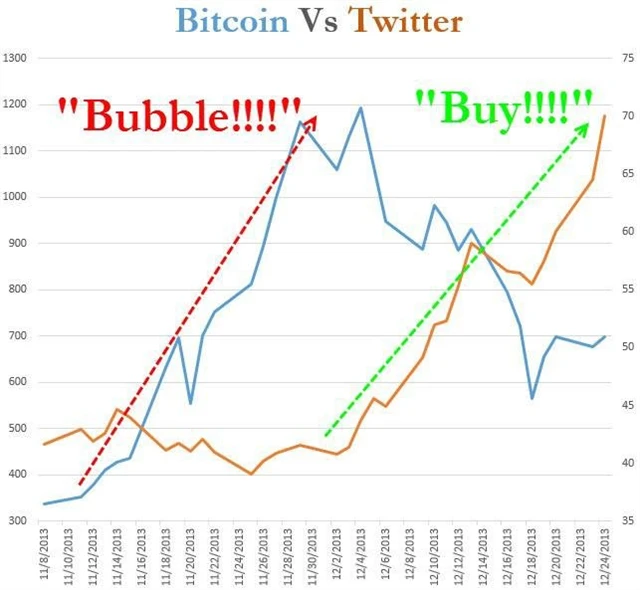 Na grafu jsou znázorněny vývoje cen bitcoinu a akcií Twitteru. Zatímco od bitcoinu jako měny většina seriózních ekonomů dává ruce pryč, Twitter se jako akcie analytikům velice líbí. A není divu - Twitter má totiž produkt, který prakticky nevydělává na tom, jak jednoduchý je přístup k němu, zatímco bitcoin je virtuální měna (nebo platební systém). A navíc bitcoin nemá vnitřní hodnotu, neobchoduje se na tisícinásobku letošního EBITDA a 340násobku toho v roce 2014, dokonce se ani neblíží 40násobku očekávaných tržeb v roce 2014. A proto je bitcoin - měna nezávislá na centrálních bankách, které tisknou peníze jako o život - bublina, zatímco Twitter perspektivní trendy investice. Za poslední 4 dny zhodnotil na burze o čtvrtinu, to je přece důkaz!