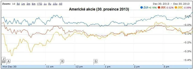 Index Dow jako jediný rostl, přidal 0,16 % a uzavřel na novém historickém maximu 16 504,29 bodu. Index S&P 500 0,02 % ztratil, když klesl na 1 841,07 bodu, technologický Nasdaq poklesl o 0,06 % na 4 154,2 bodu.