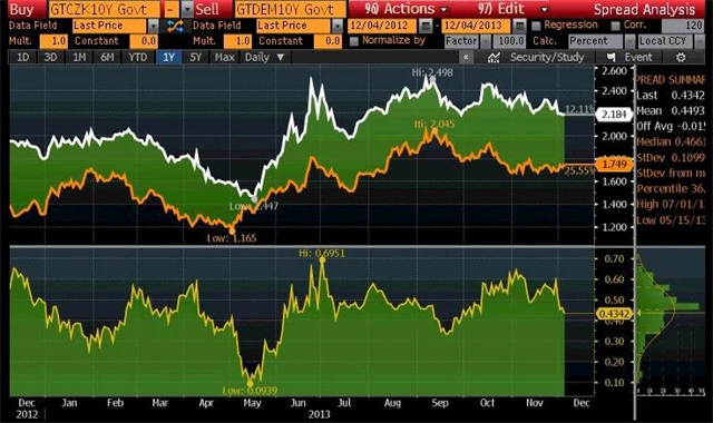 Rozdíl mezi výnosy desetiletých českých a německých státních dluhopisů klesl na dvouměsíční minimum