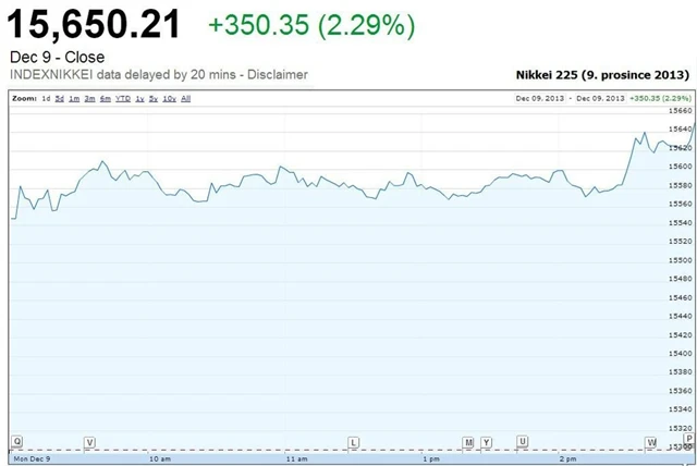 Nikkei v pondělí stoupl o 2,29 % a uzavřel na 15 650,21 bodu. Zaznamenal tak nejvýraznější denní nárůst za poslední tři měsíce. Jihokorejský Kospi posílil o 1,01 %, naopak australský S&P/ASX 200 oslabil o 0,80 %.