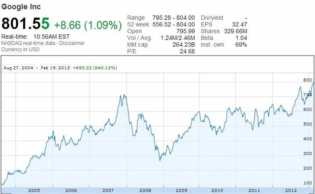 Cena akcií internetové společnosti Google dnes poprvé překonala hranici 800 dolarů. Investoři znovu začali věřit, že firma je schopná stabilně zvyšovat zisk díky svému dominantnímu postavení na trhu internetového vyhledávání a důležitému postavení na trhu s mobilními přístroji.