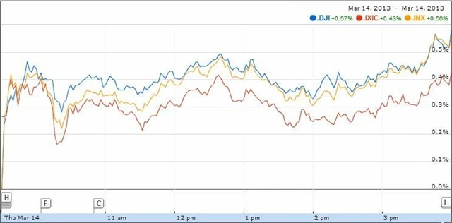 Širší index S&P 500 posílil o 0,56 % na 1 563,23 bodu a index technologického trhu Nasdaq Composite se zvýšil o 0,43 % na 3 258,93 bodu. Index S&P 500 se tak opět přiblížil ke svému závěrečnému maximu 1 565,15 bodu z října 2007.