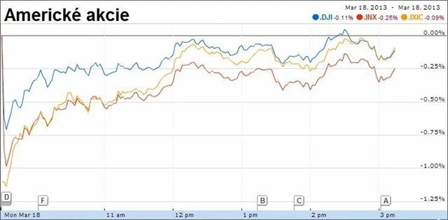 Hlavní americké indexy zahajovaly pondělní obchodování ve výrazných mínusech kvůli nervozitě okolo Kypru a možnosti "nákazy" do dalších zemí eurozóny. Dow se ovšem během odpoledne dokázal dokonce dostat do plusu. Kdepak, tady se "věří v Bernankeho", možná i v další centrální bankéře v čele se Super Mariem. EUR/USD se okolo 20:00 českého času drží okolo 1,293.