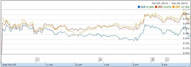 Investoři tak konečně mohli zaměřit svou pozornost na něco jiného než problémy kolem Kypru. Index Dow dosáhl nového intradenního maxima (v březnu již poosmé) na 14 546,82 bodu. Mezi největší tahouny indexu patřil American Express, naopak zaostávaly akcie Caterpillaru.