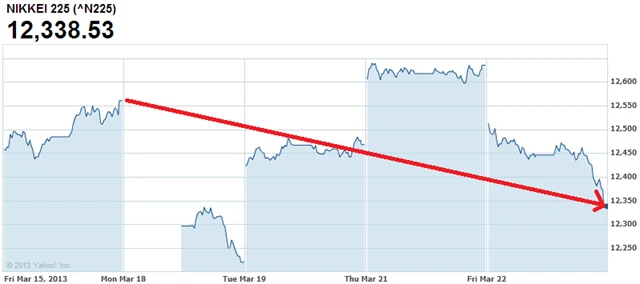 Japonská jen v posledních dnech kvůli problémům Kypru posiluje vůči euru, což akciím příliš nepomáhá. V pátek index Nikkei 225 ztratil 2,35 %.