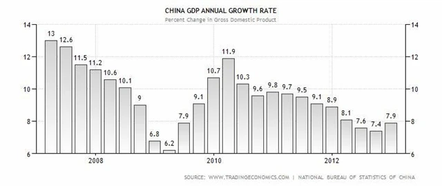 Čínská ekonomika loni stoupla o 7,8 %, tedy nejpomalejším tempem od roku 1999. Ve čtvrtém čtvrtletí se jí však podařilo zastavit zpomalování růstu, které trvalo sedm čtvrtletí, a hrubý domácí produkt se zvýšil o 7,9 %.