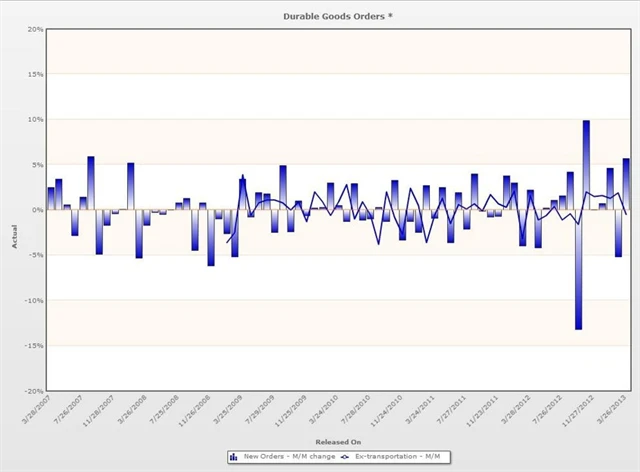 Objednávky zboží dlouhodobé spotřeby v USA za únor: +5,7 % (leden: -3,8 %, odhad: +3,9 %)