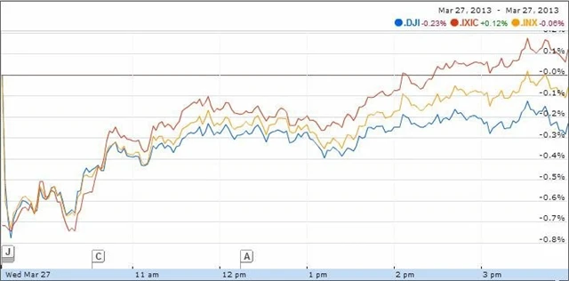 Americké akcie ve středu vesměs mírně oslabily. Trh nadále podkopávají obavy z dopadu finanční pomoci Kypru na eurozónu a investory znervóznily nepříznivé výsledky aukce nových státních dluhopisů v Itálii. Kvůli Kypru a Itálii se kurz eura propadl na nové čtyřměsíční minimum.