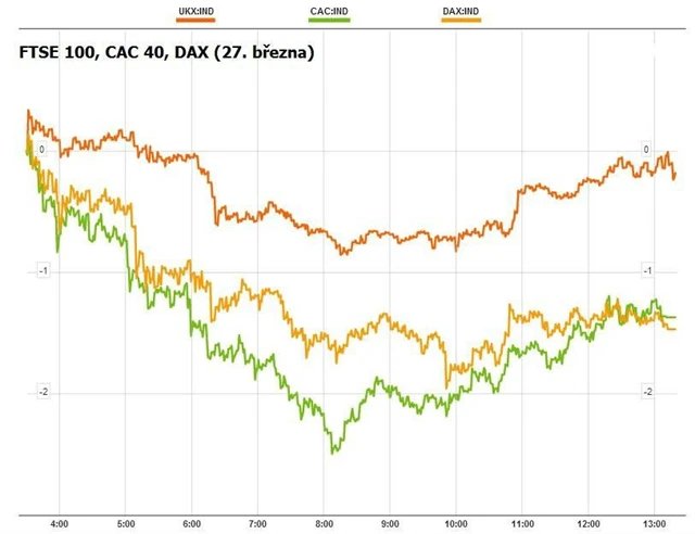 Britský FTSE 100 klesl jen mírně 0,18 % a zakončil den na 6 387,56 bodu, francouzský CAC 40 oslabil o 0,99 % na 3 711,64 bodu, německý DAX o 1,15 % na 7 789,09 bodu. Propadly i burzy v Itálii (FTSE MIB -0,92 %) a Španělsku (IBEX 35 -1,13 %).