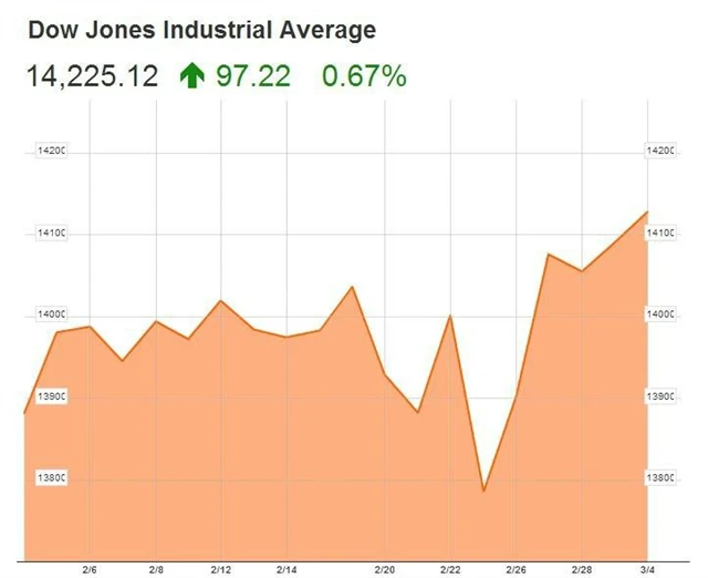 Při otevření americké burzy index Dow Jones v souladu s očekáváním strhl rekord z 9. října 2007 a dosáhl 14 175,67 bodu. Nejlépe si od té doby vedly akcie IBM a Home Depot. Automatické škrty ve vládních výdajích, které ve Spojených státech vešly v platnost 1. března, trh očividně nevyděsily.