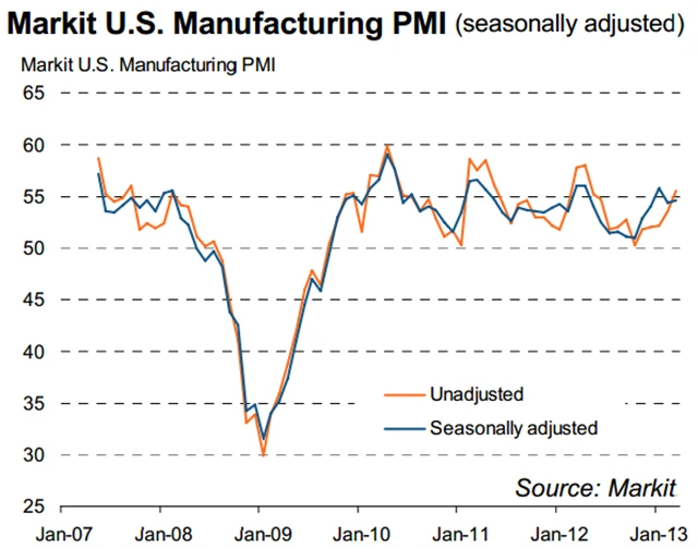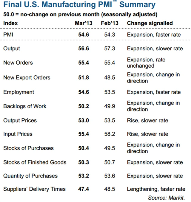Společnost Markit uvedla, že index aktivity zpracovatelského průmyslu v prvním čtvrtletí stoupl na 54,9 bodu z 52,6 bodu v posledních třech měsících loňského roku. Pokud se index nachází nad hranicí 50 bodů, ukazuje na růst aktivity. "Toto odvětví v prvním čtvrtletí zajistilo ekonomice značnou podporu," uvedl hlavní ekonom společnosti Markit Chris Williamson.