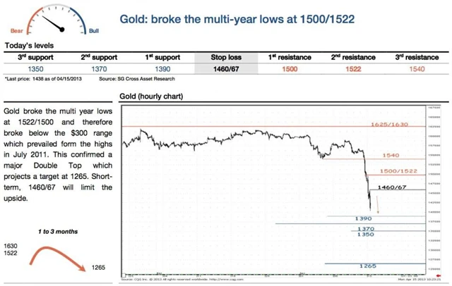 Analytik ze Société Générale mezitím předpovídá na základě technické analýzy propad ceny zlata na 1 265 USD za trojskou unci během 1 až 3 měsíců.