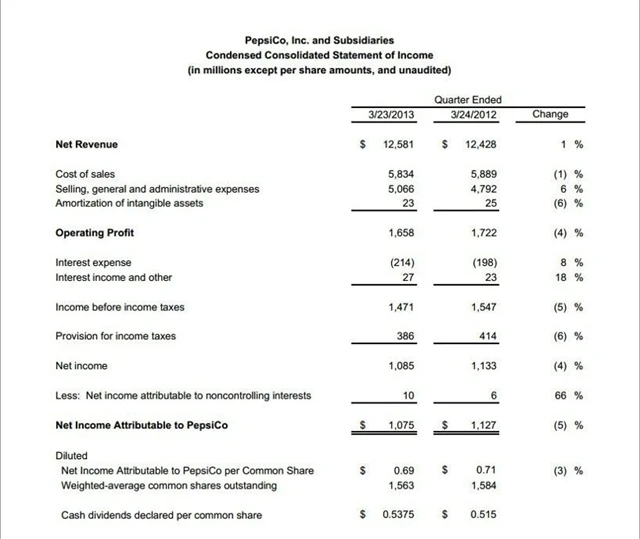 Americkému výrobci nealkoholických nápojů PepsiCo klesl čistý zisk v prvním čtvrtletí letošního roku na 1,08 miliardy dolarů. Loni ve stejném období to bylo 1,13 miliardy dolarů. K poklesu zisku podle ní přispěly změny některých devizových kurzů. I tak byly čtvrtletní hospodářské výsledky společnosti lepší, než čekali analytici.