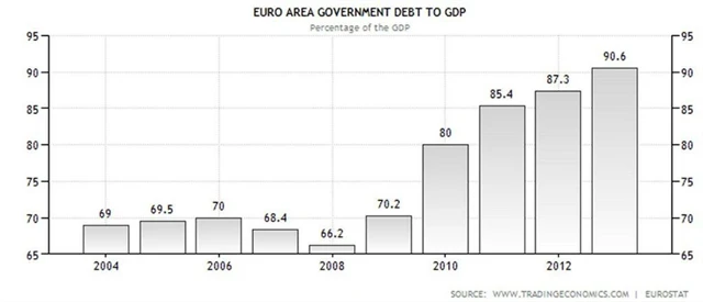 Dluh eurozóny vystoupal v roce 2012 na rekordních 90,6 % HDP, deficit eurozóny v roce 2012 dosáhl -3,7 %