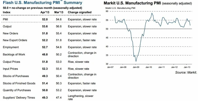 "Data vyvolávají obavy z toho, že růst amerického průmyslu rapidně ztrácí dynamiku, protože podniky a domácnosti se bojí dopadů zvýšených daní a škrtů vládních výdajů," řekl ke zprávě hlavní ekonom Markit Chris Williamson. Podle něho také výsledek naznačuje, že roční tempo růstu produkce se na počátku druhého čtvrtletí zpomalilo na 2 % z 8% úrovně v prvním čtvrtletí.