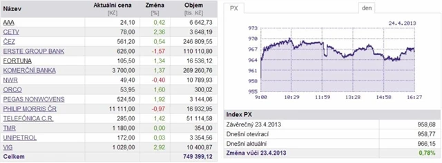 Pražská burza už čtvrtý den v řadě posílila, index PX vzrostl o 0,78 % na 966,15 bodu. Burze v růstu pomáhaly především akcie Komerční banky a energetické firmy ČEZ, ačkoli podražily téměř všechny emise. Dva zmíněné tituly obstaraly zhruba polovinu objemů obchodování. Ani pokles jedné z předních emisí, cenných papírů bankovní skupiny Erste Group Bank, tak posílení pražské burzy neohrozil.