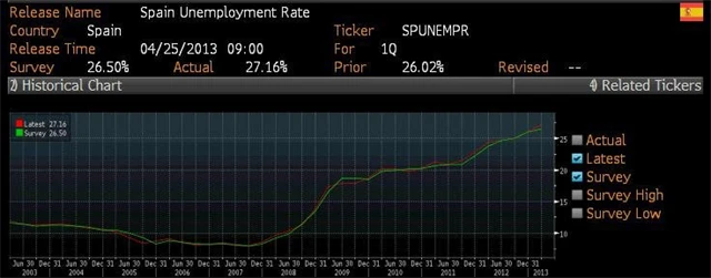 Počet nezaměstnaných stoupl poprvé na více než 6 milionů. Toto číslo představuje 27,2 % ekonomicky aktivních obyvatel (pro srovnání v minulých třech měsících to bylo podle španělského statistického úřadu 26,02 %). Ekonomové oslovení agenturou Bloomberg očekávali mírnější růst - na 26,5 %.