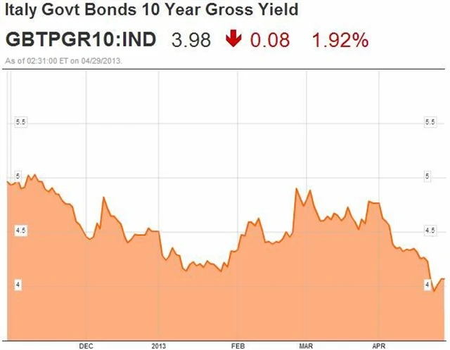 Itálie prodala 10leté dluhopisy (kupón 4,5 %) s průměrným výnosem 3,94 % (v březnu 4,66 %). Výnos je nejnižší od října 2010.