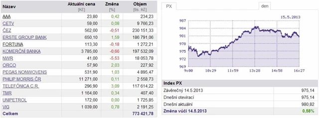 Index PX přidal 0,58 %. Vzhůru ho táhly akcie Telefóniky, která oznámila spuštění moderních LTE sítí v některých pražských obvodech, a Erste Group Bank. Ztrácel naopak ČEZ, možná i kvůli pesimistickým komentářům RWE v rámci zveřejnění kvartálních výsledků. Před čtvrtečními výsledky pokračoval prudký sestup akcií uhelné NWR.
