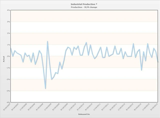 Průmyslová výroba ve Spojených státech v dubnu klesla o 0,5 %, nejvíce za posledních osm měsíců. Analytici čekali mírnější pokles 0,2 % po březnovém růstu, který byl revidován na +0,3 % z +0,4 %.