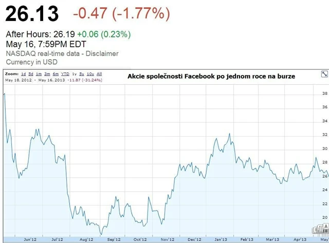 Před rokem 18. května vstoupila největší světová sociální síť Facebook na burzu NASDAQ. Loňský nejočekávanější burzovní debut byl ale zklamáním pro investory a analytiky, protože vládla očekávání, že akcie stoupnou o desítky procent.